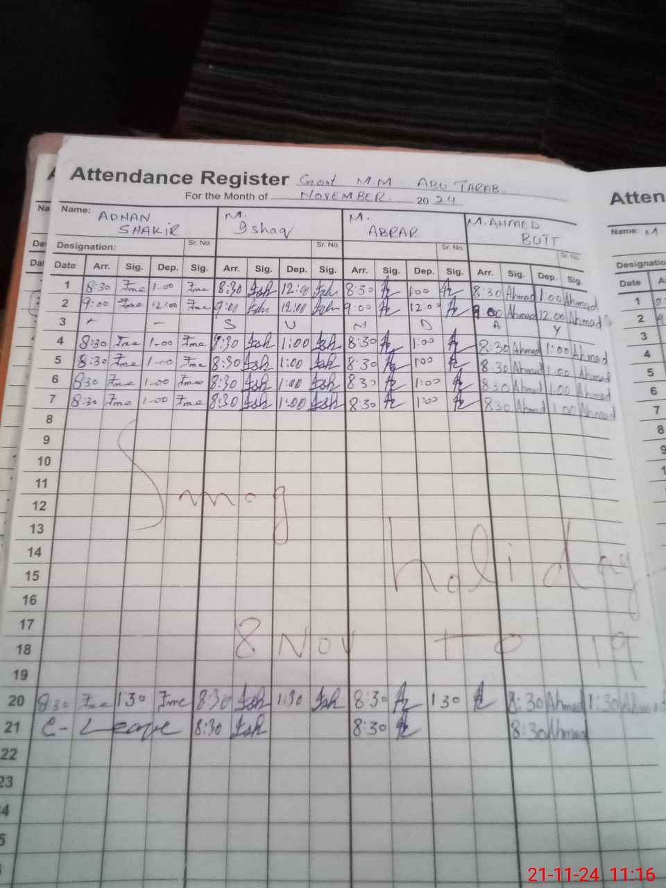 | CNIC | Full Name | Designation | R/C | Absence During Last Calender Month |