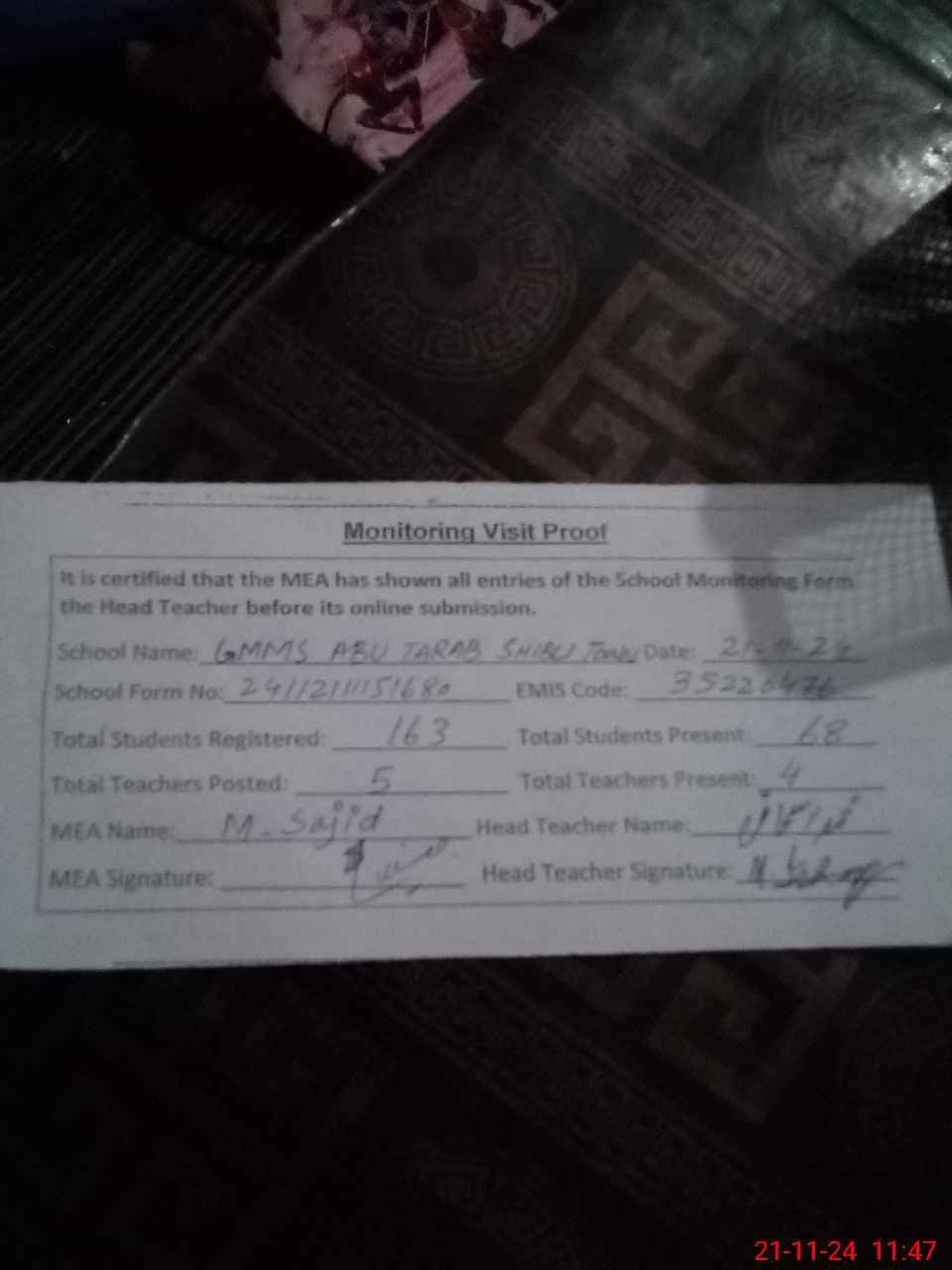 | Remarks (Use Separate Page if Required): NSB and FTF record is not available PST Sheikh Muhammad Moghis has expired on 28 Aug 2024 but his name is not removed from monitoring app teachers list Teachers were busy in gossips when I entered in the school A difference of 84 students found in Roznamcha and head count of all the present students 35220476 | |||||