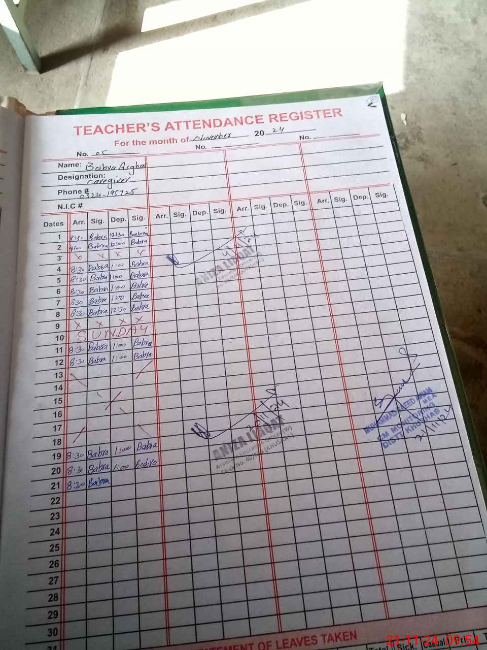 | CNIC | Full Name | Designation | R/C | Absence During Last Calender Month |