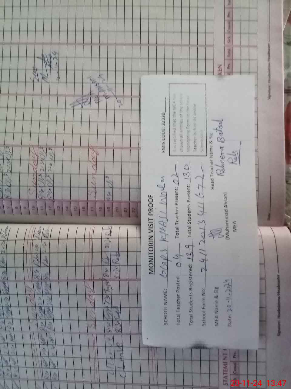 | Attendance Register | Head Teacher | MEA with School | Visit Proof |