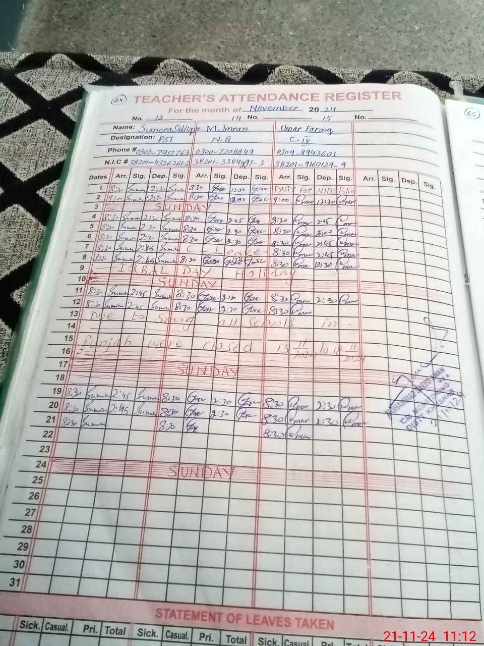 | CNIC | Full Name | Designation | R/C | Absence During Last Calender Month |