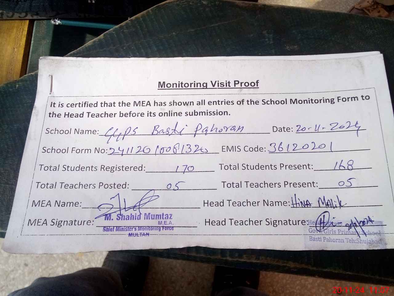 | Attendance Register | Head Teacher | MEA with School | Visit Proof |