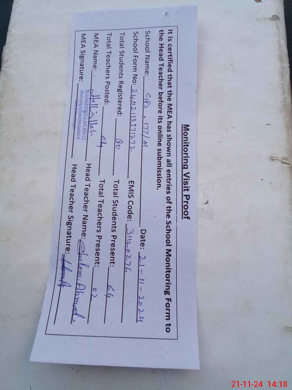 | EMIS Code: 31120276 | Name of School: GPS CHAK NO 177/M | |||