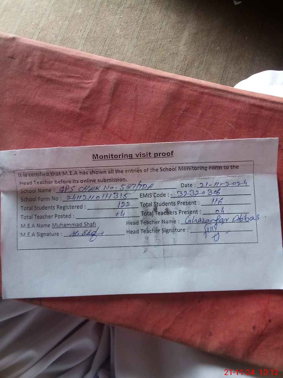 | EMIS Code: 32320306 | Name of School: GPS CHAK NO.587 TDA | |||