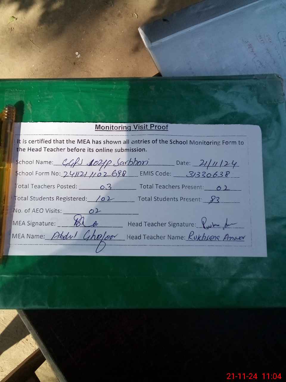 | Attendance Register | Head Teacher | MEA with School | Visit Proof |