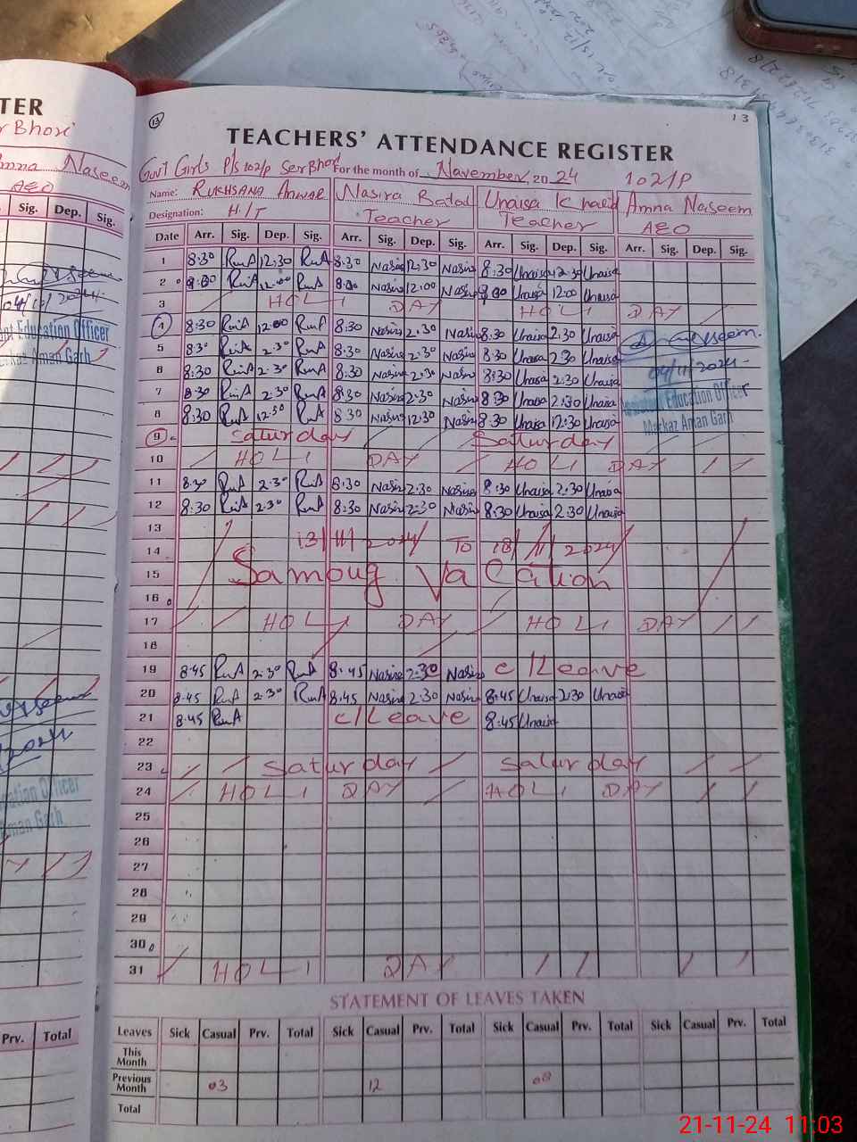 | Leave | Duty | Absent | Maternity | Medical | Ex- Pak |