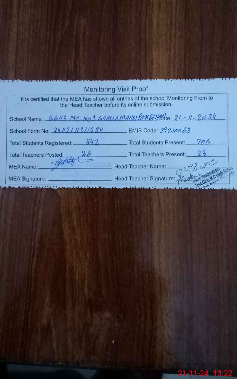 | EMIS Code: 39210063 | Name of School: GGHS MC NO. 1 GHALLA MANDI PAKPATTAN | |||