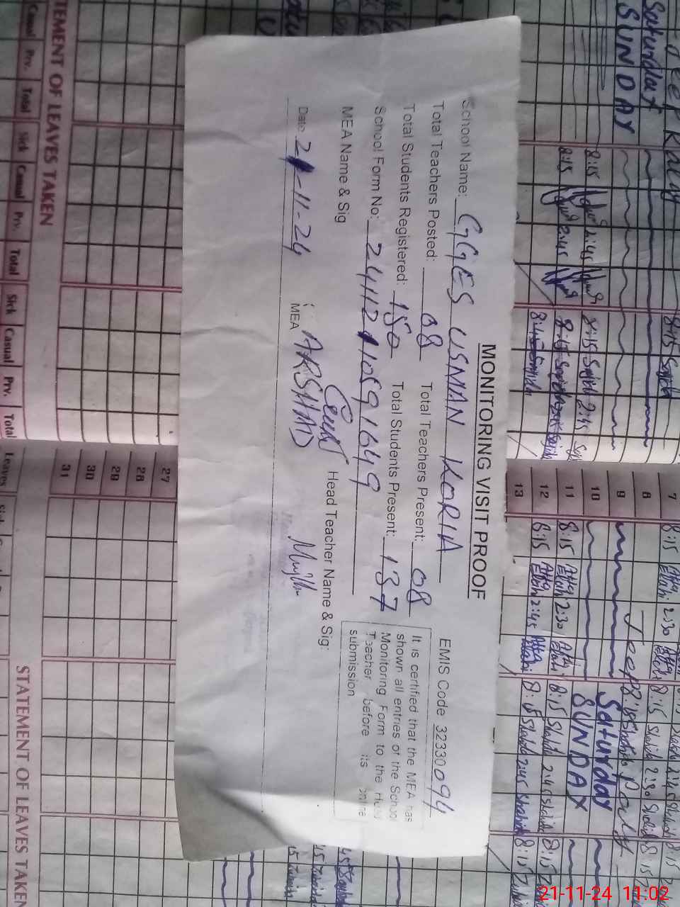 | Attendance Register | Head Teacher | MEA with School | Visit Proof |