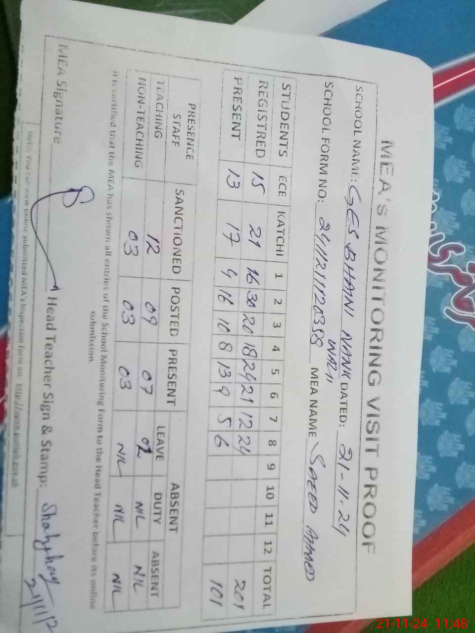 | Attendance Register | Head Teacher | MEA with School | Visit Proof |
