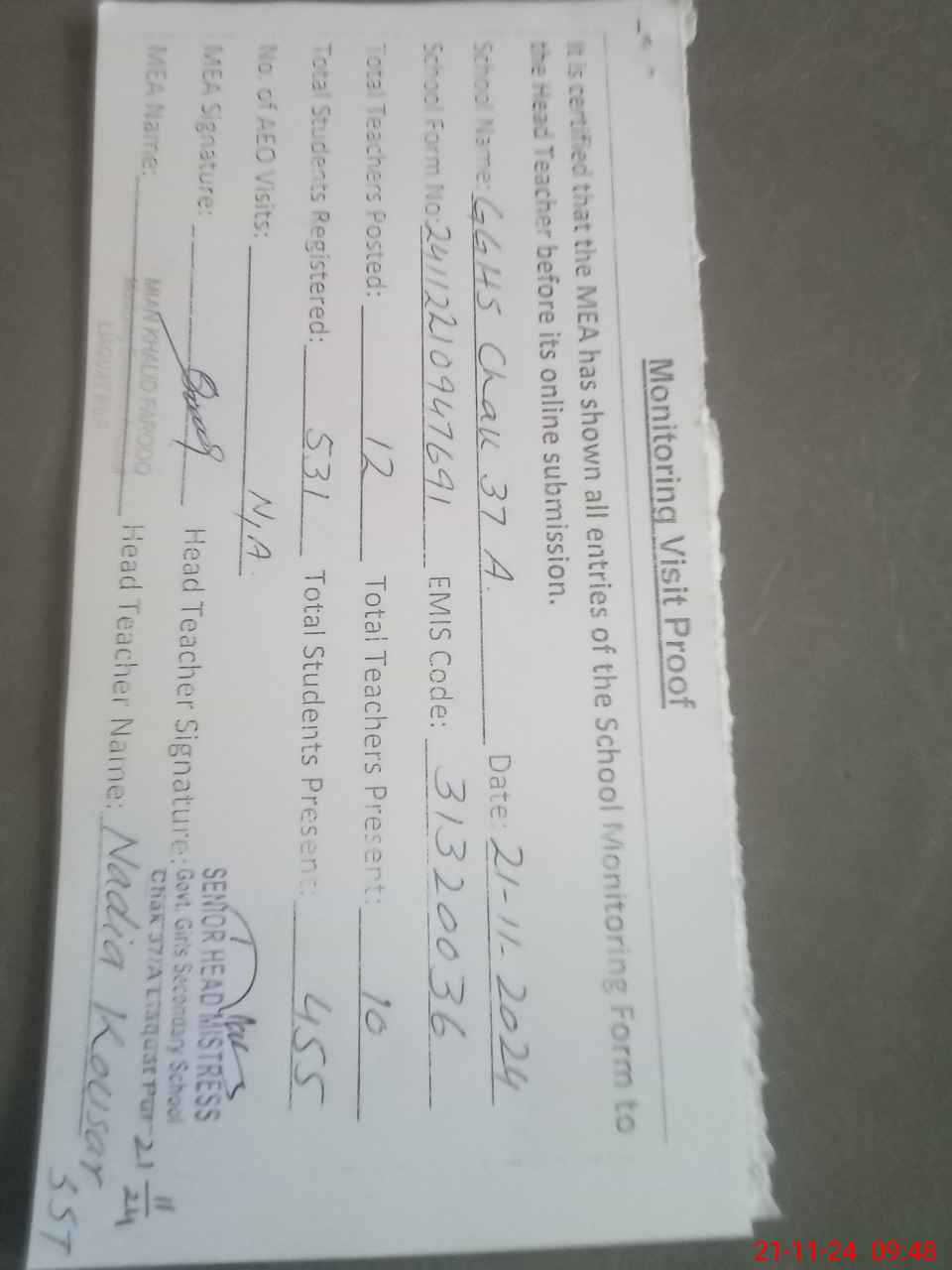 | Attendance Register | Head Teacher | MEA with School | Visit Proof |