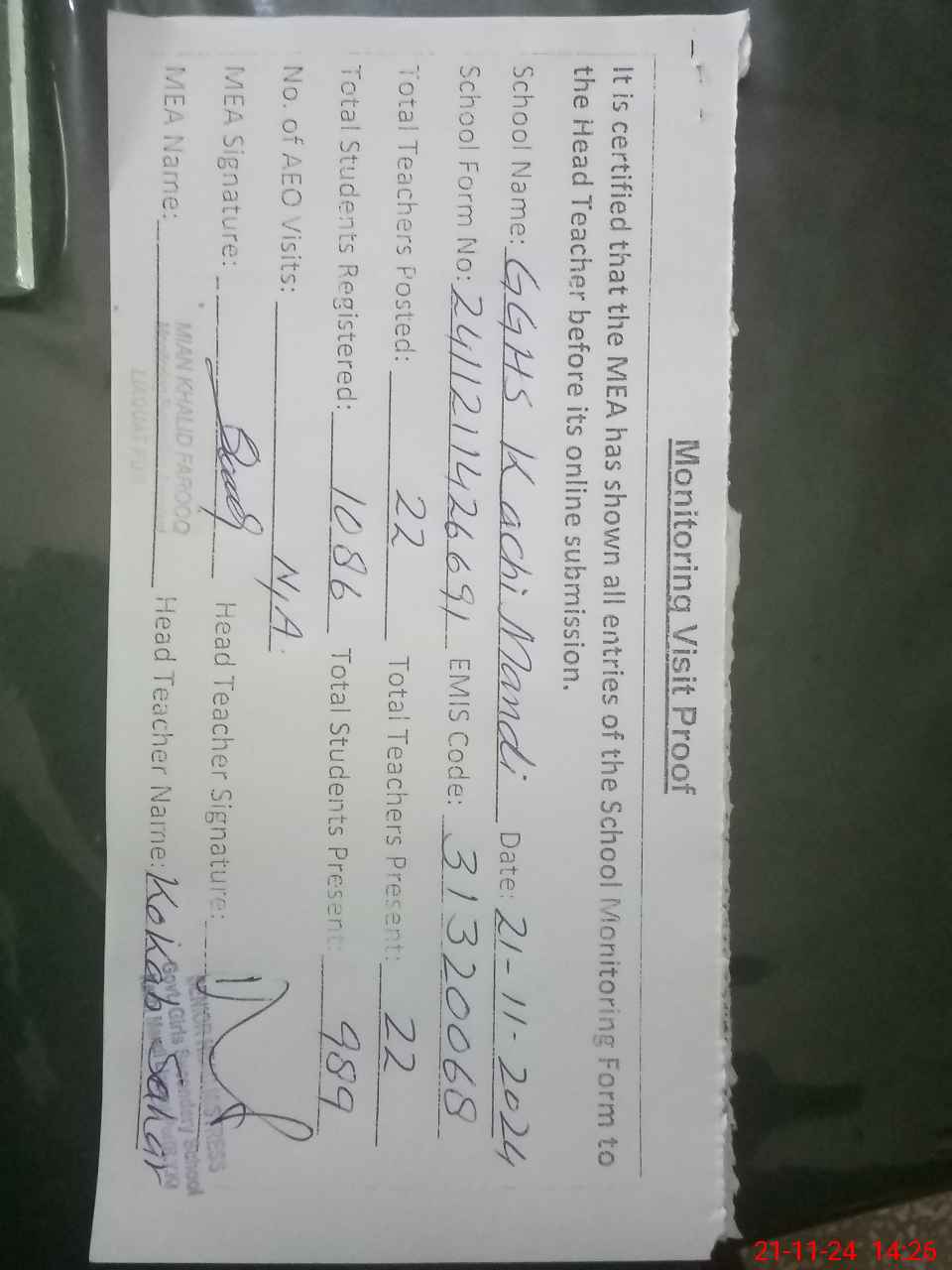 | Attendance Register | Head Teacher | MEA with School | Visit Proof |
