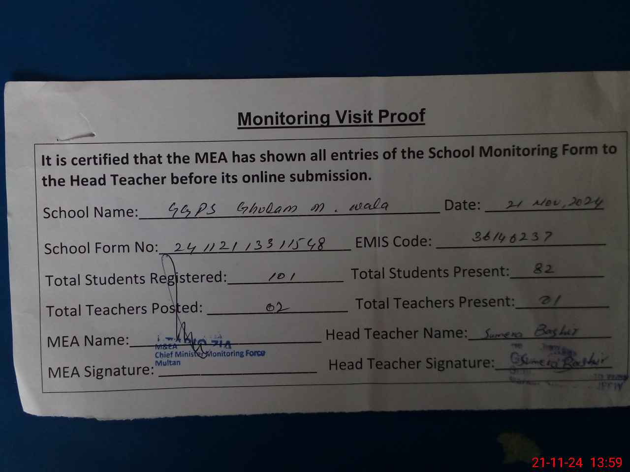 | Remarks (Use Separate Page if Required): Student attendance may please be updated as classes passed out from school since long Khizar Abbas Sweeper is temporarily attached with school and is present Attachment data could not be entered on relevant window NSB record provided UpTo July 2024 | |||||