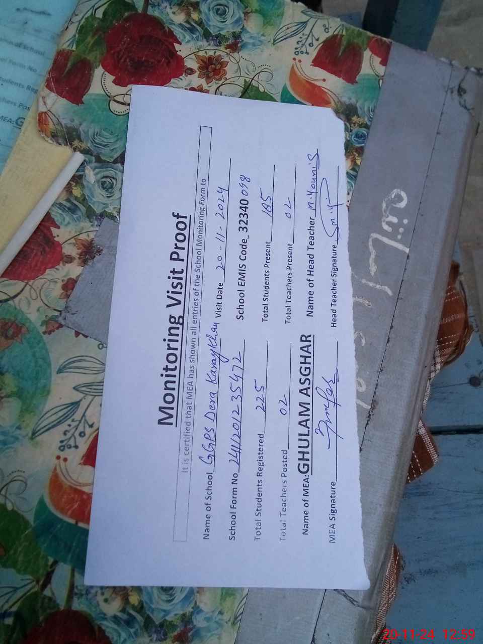 | Attendance Register | Head Teacher | MEA with School | Visit Proof |