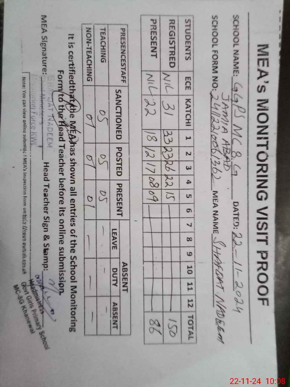| EMIS Code: 36420368 | Name of School: GGPS MC 8-G, JAMIA ABAD KHANEWAL | |||
