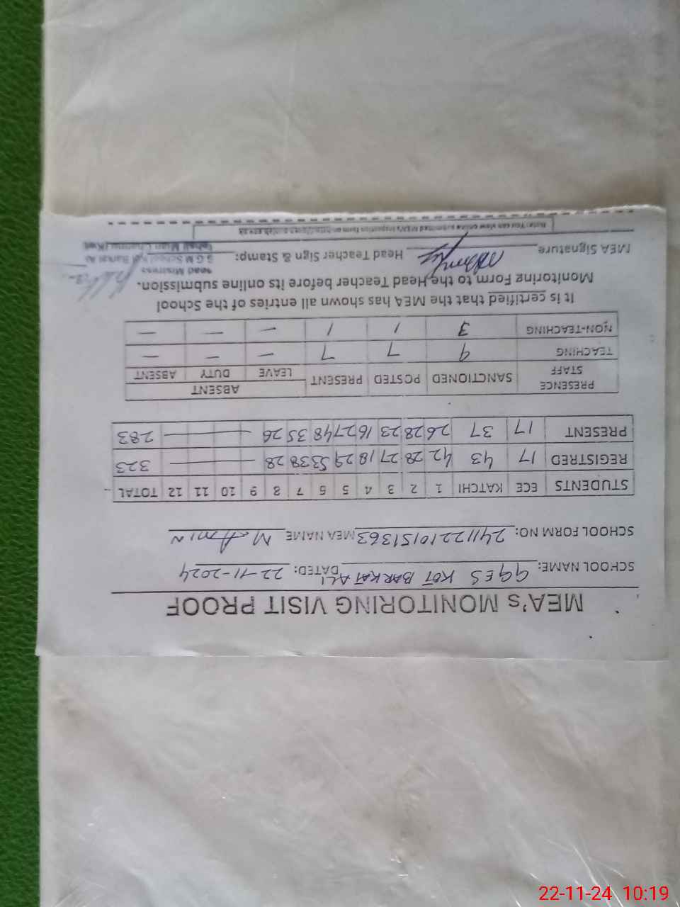 | Attendance Register | Head Teacher | MEA with School | Visit Proof |