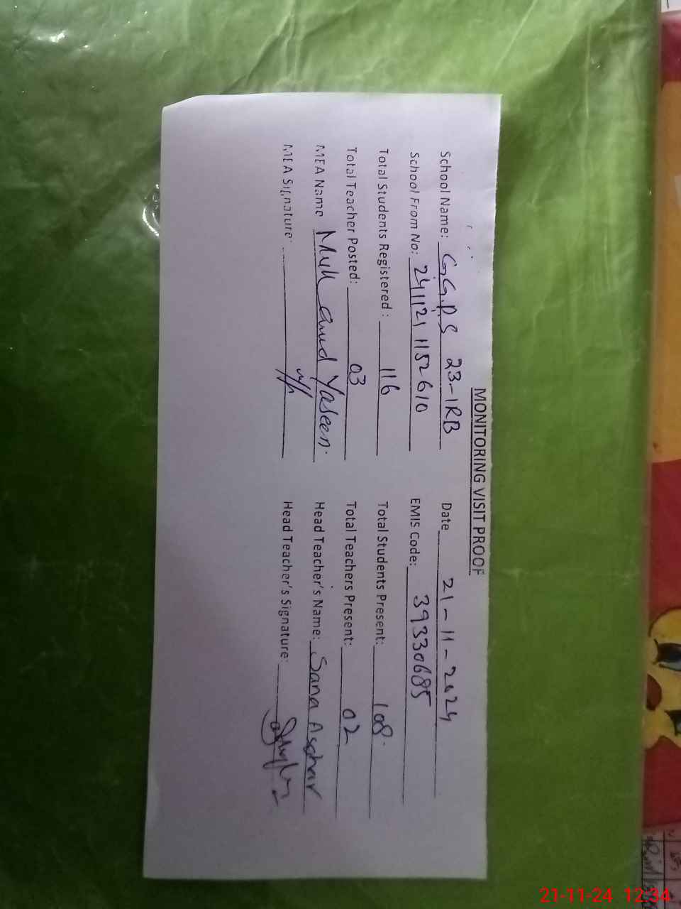| EMIS Code: 39330685 | Name of School: GGPS CHAK NO. 23/1-RB | |||