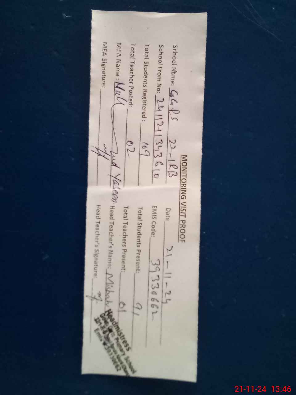 | EMIS Code: 39330662 | Name of School: GGPS CHAK NO. 22/1-RB | |||
