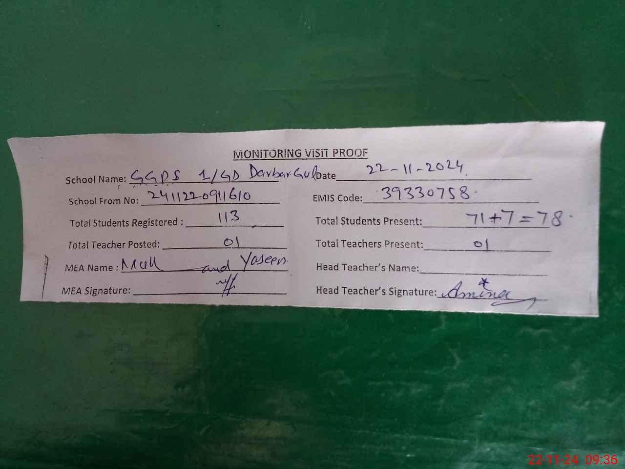 | EMIS Code: 39330758 | Name of School: GGPS CHAK NO.1/GD DARBAR GUL | |||