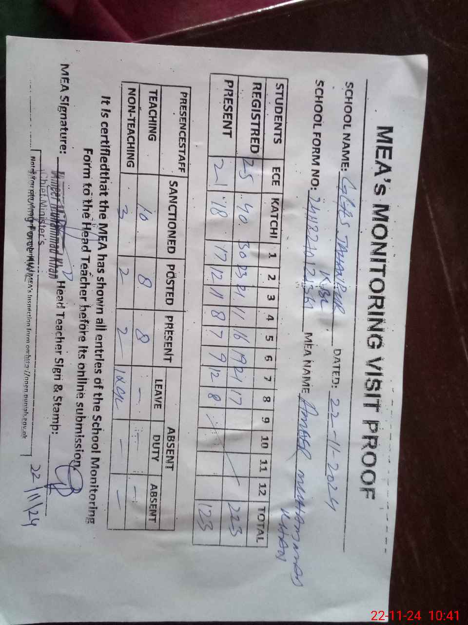 | Attendance Register | Head Teacher | MEA with School | Visit Proof |