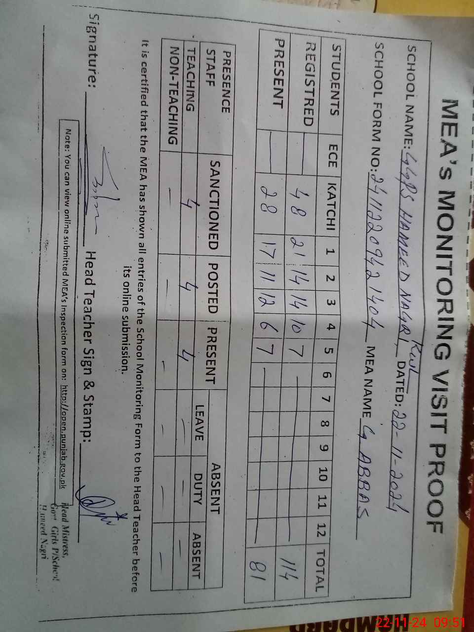 | Attendance Register | Head Teacher | MEA with School | Visit Proof |