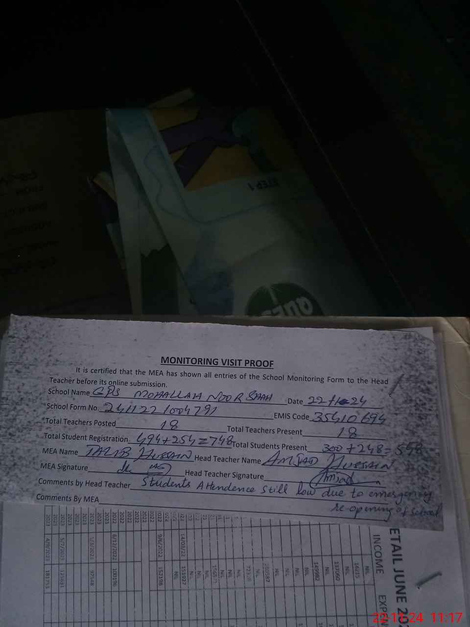 | Attendance Register | Head Teacher | MEA with School | Visit Proof |