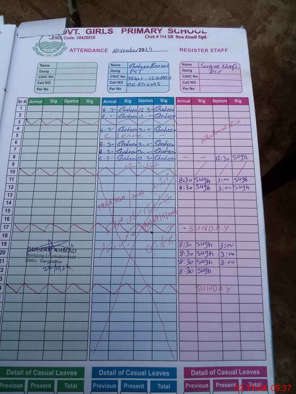 | CNIC | Full Name | Designation | R/C | Absence During Last Calender Month |