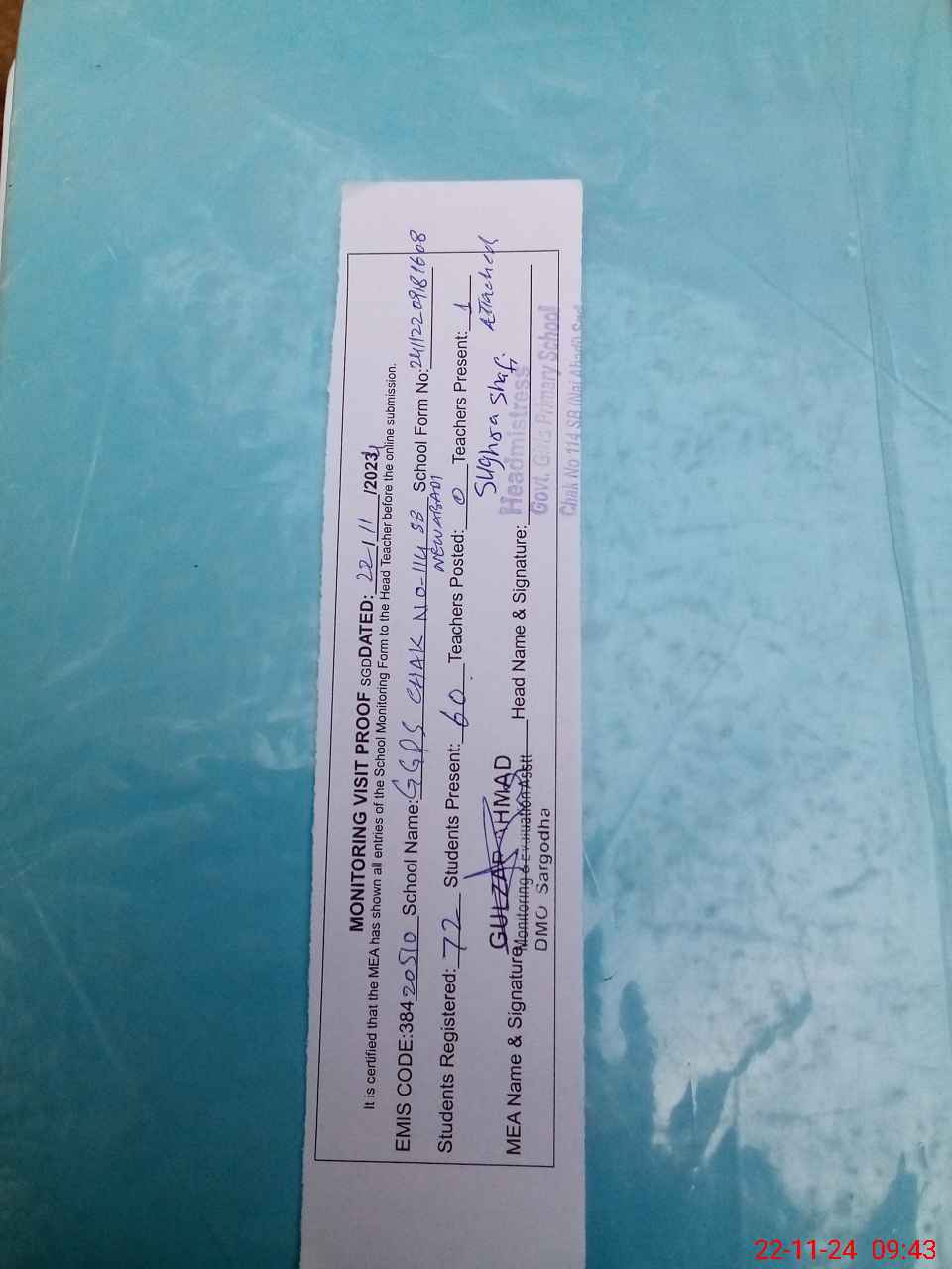 | Attendance Register | Head Teacher | MEA with School | Visit Proof |