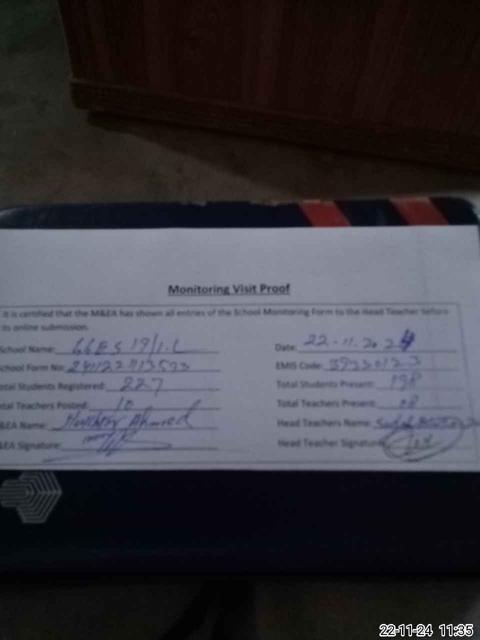 | Attendance Register | Head Teacher | MEA with School | Visit Proof |