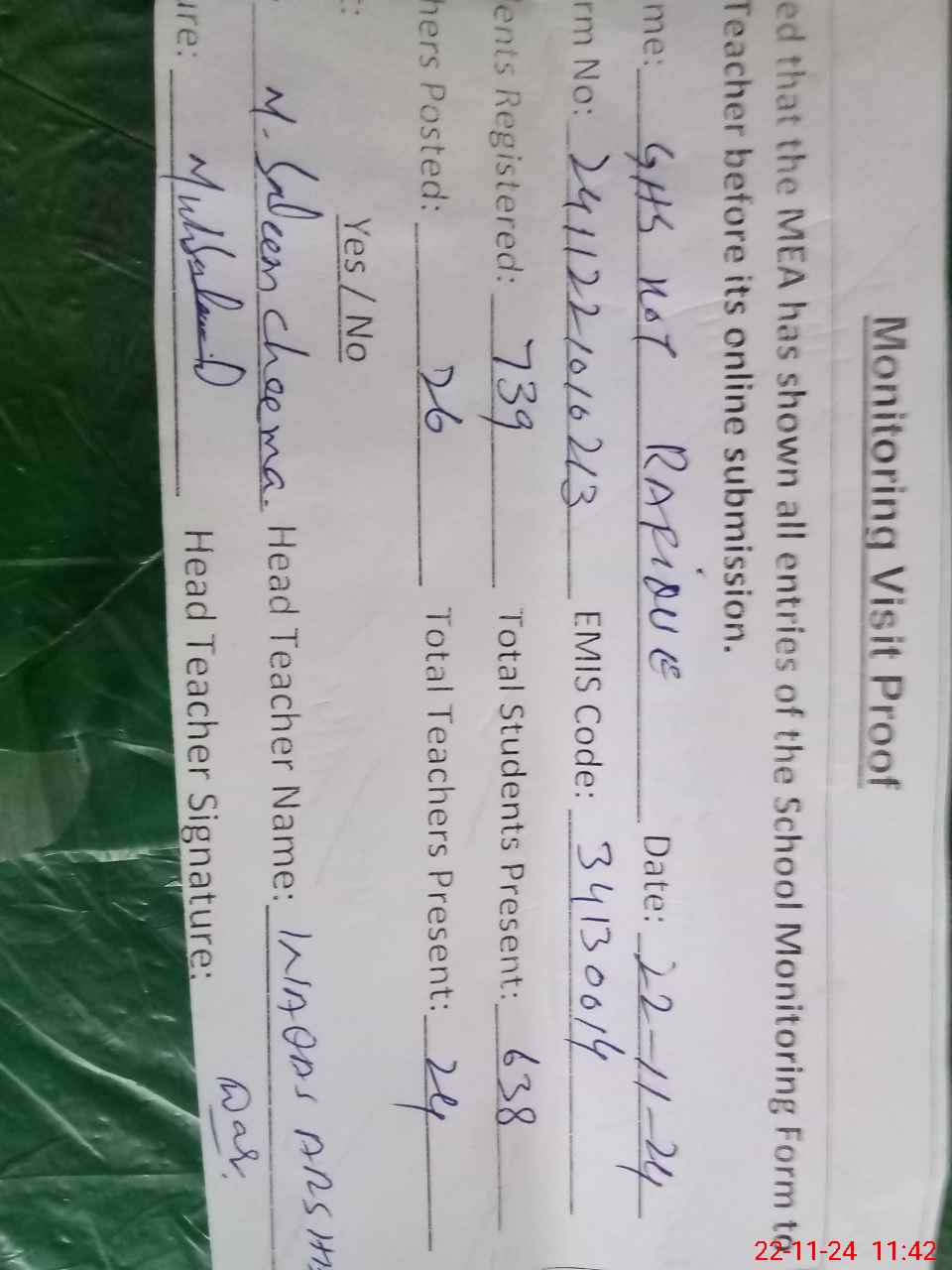 | Attendance Register | Head Teacher | MEA with School | Visit Proof |