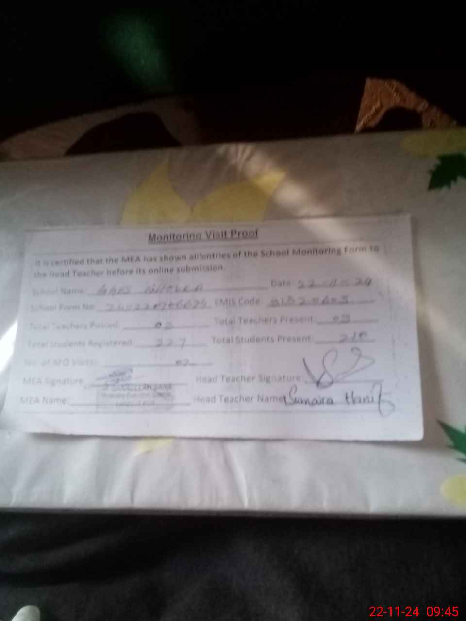 | Monitoring Date: 22-11-2024 | Start Time: 22-11-2024 09:06 AM | End Time: 22-11-2024 09:45 AM | Name of MEA: Mu**** Sa**** Ul**** Sa**** | |
