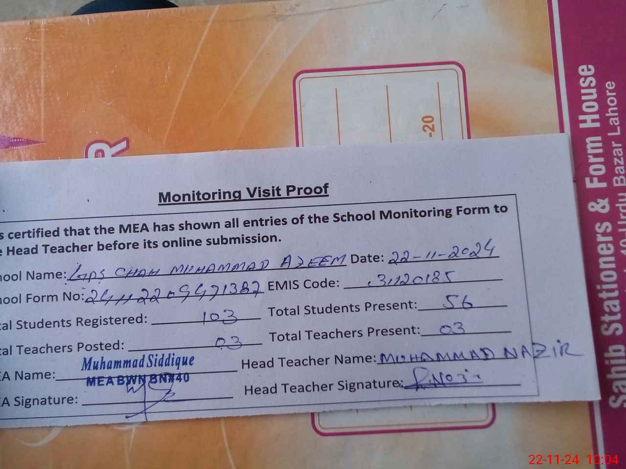 | Attendance Register | Head Teacher | MEA with School | Visit Proof |