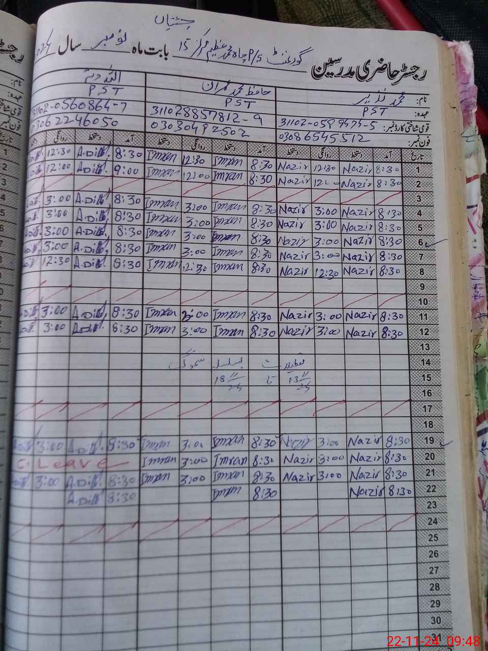 | CNIC | Full Name | Designation | R/C | Absence during last cal. month |