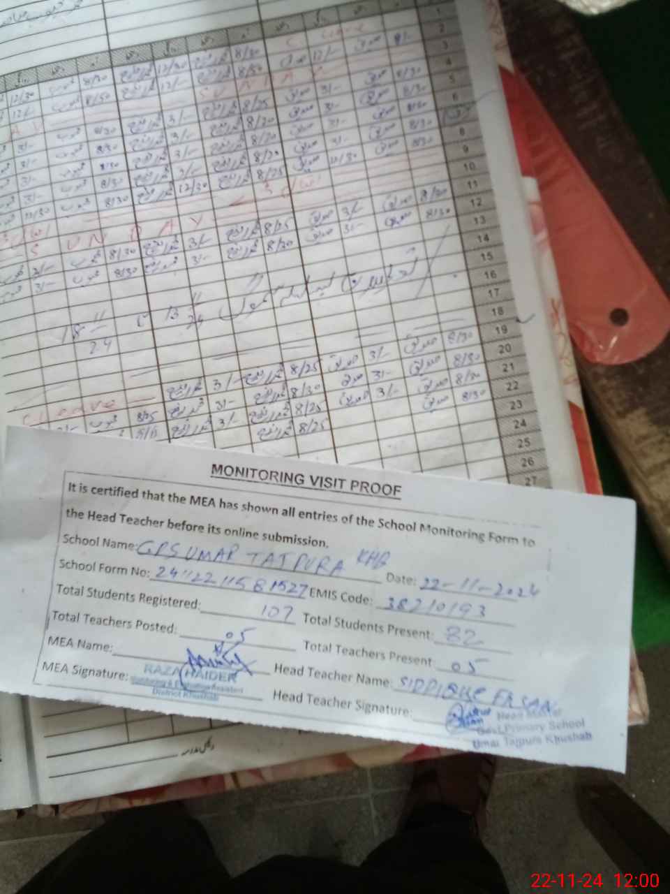 | Attendance Register | Head Teacher | MEA with School | Visit Proof |