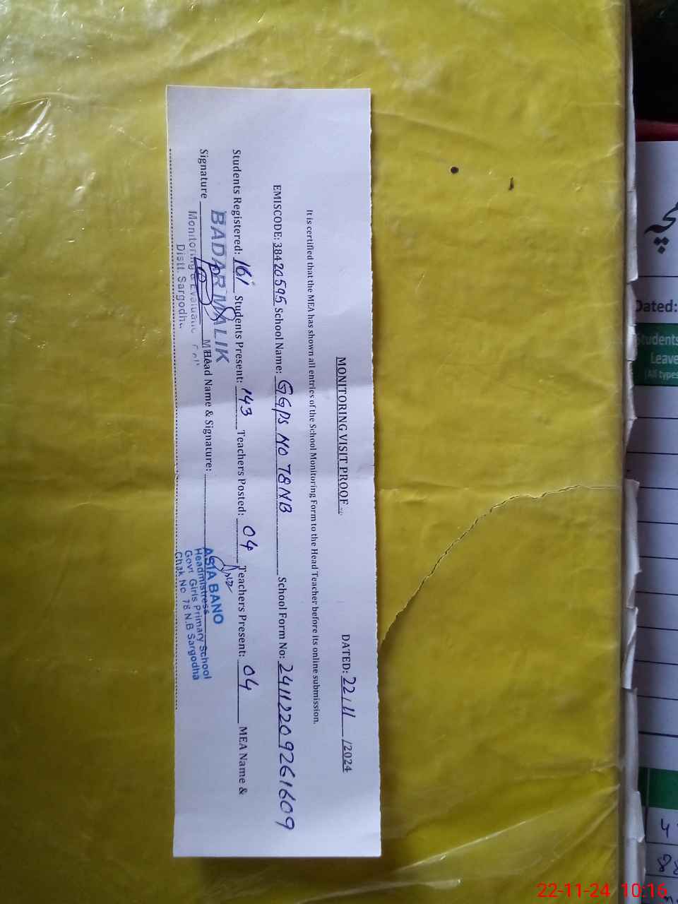 | Attendance Register | Head Teacher | MEA with School | Visit Proof |