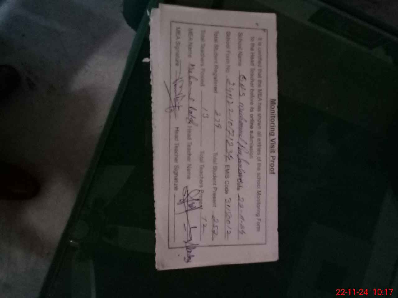 | Attendance Register | Head Teacher | MEA with School | Visit Proof |