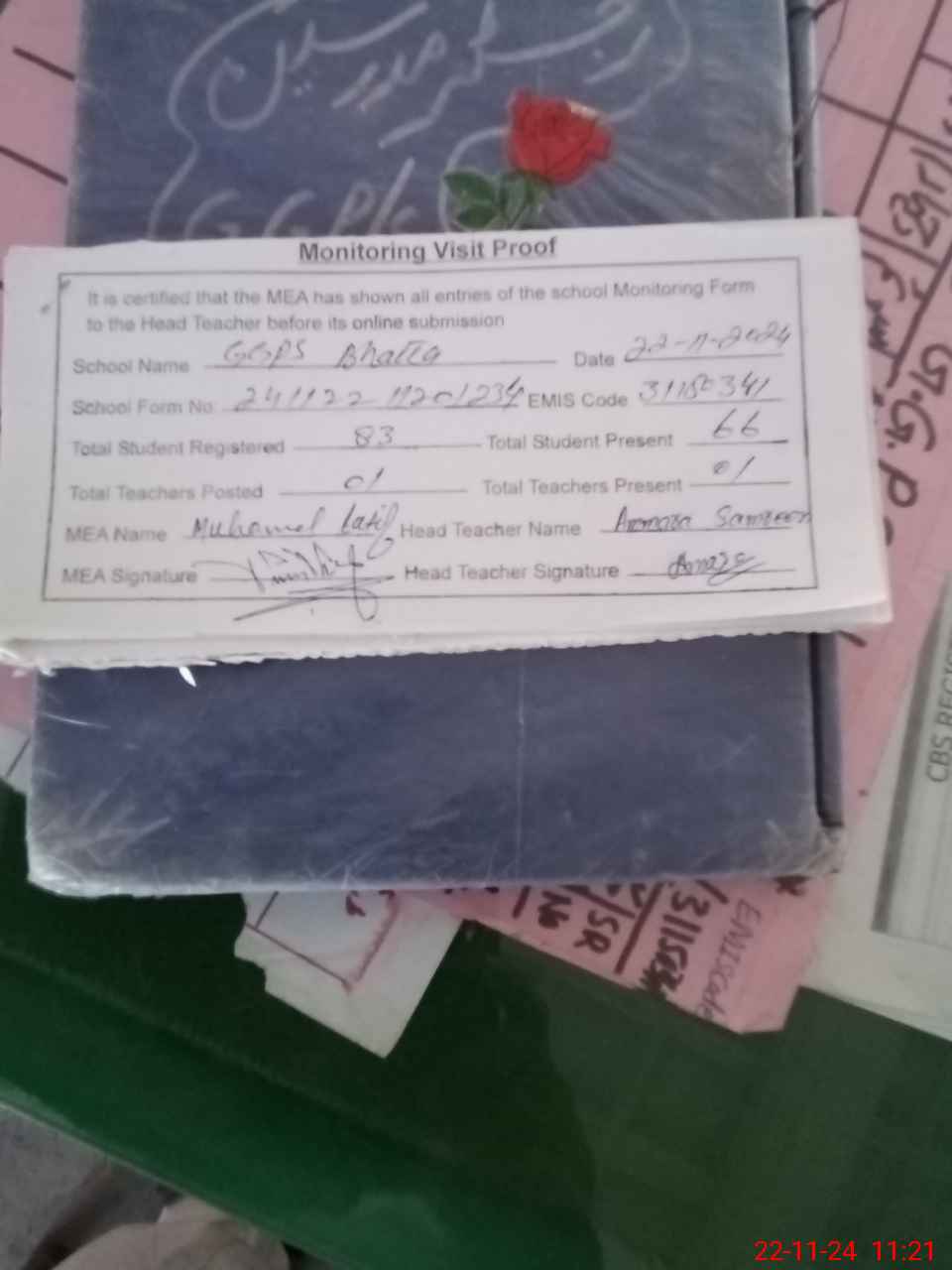 | Attendance Register | Head Teacher | MEA with School | Visit Proof |
