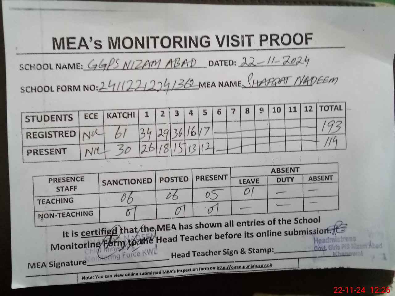 | Attendance Register | Head Teacher | MEA with School | Visit Proof |