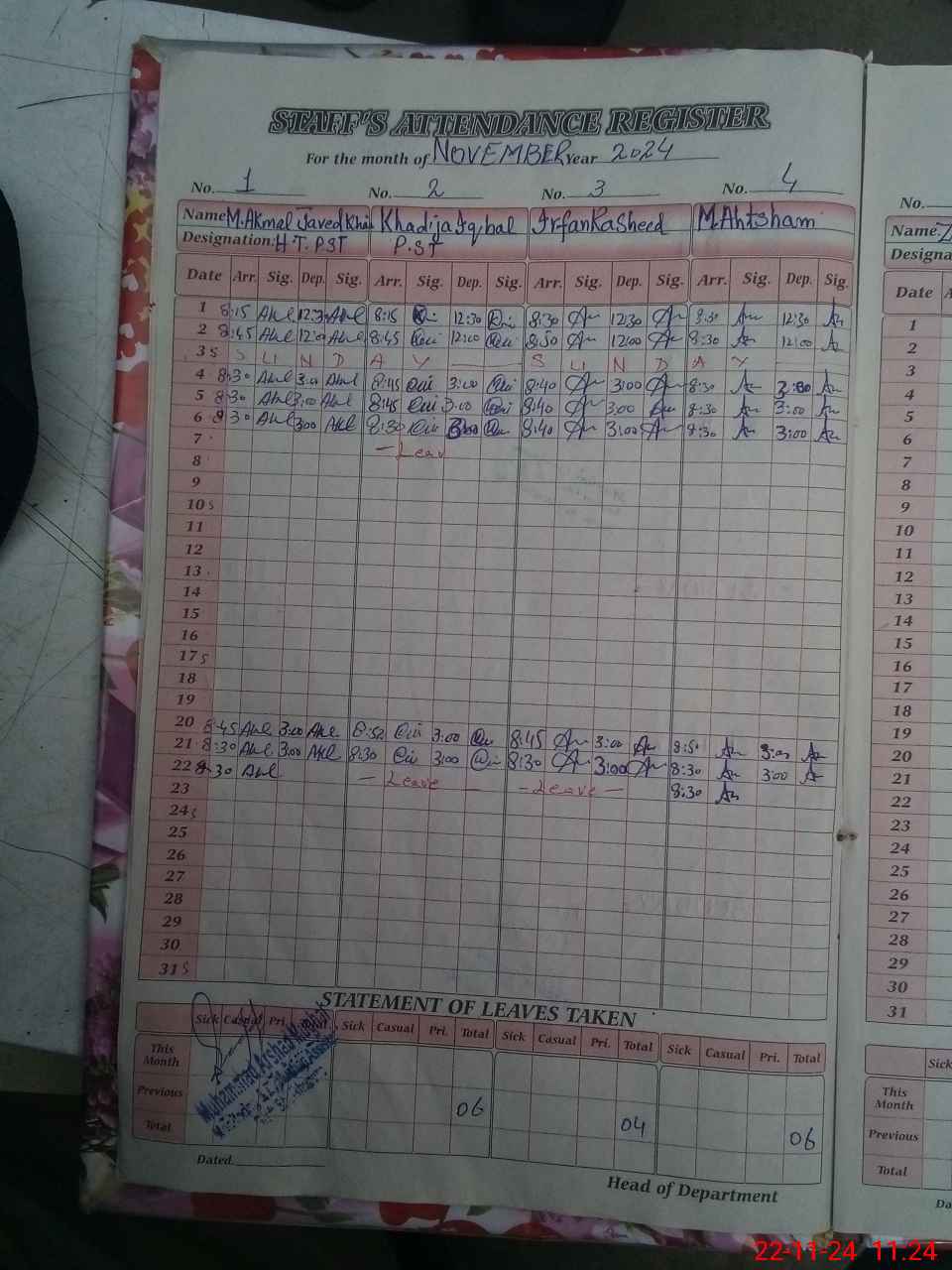 | Leave | Duty | Absent | Maternity | Medical | Ex- Pak |