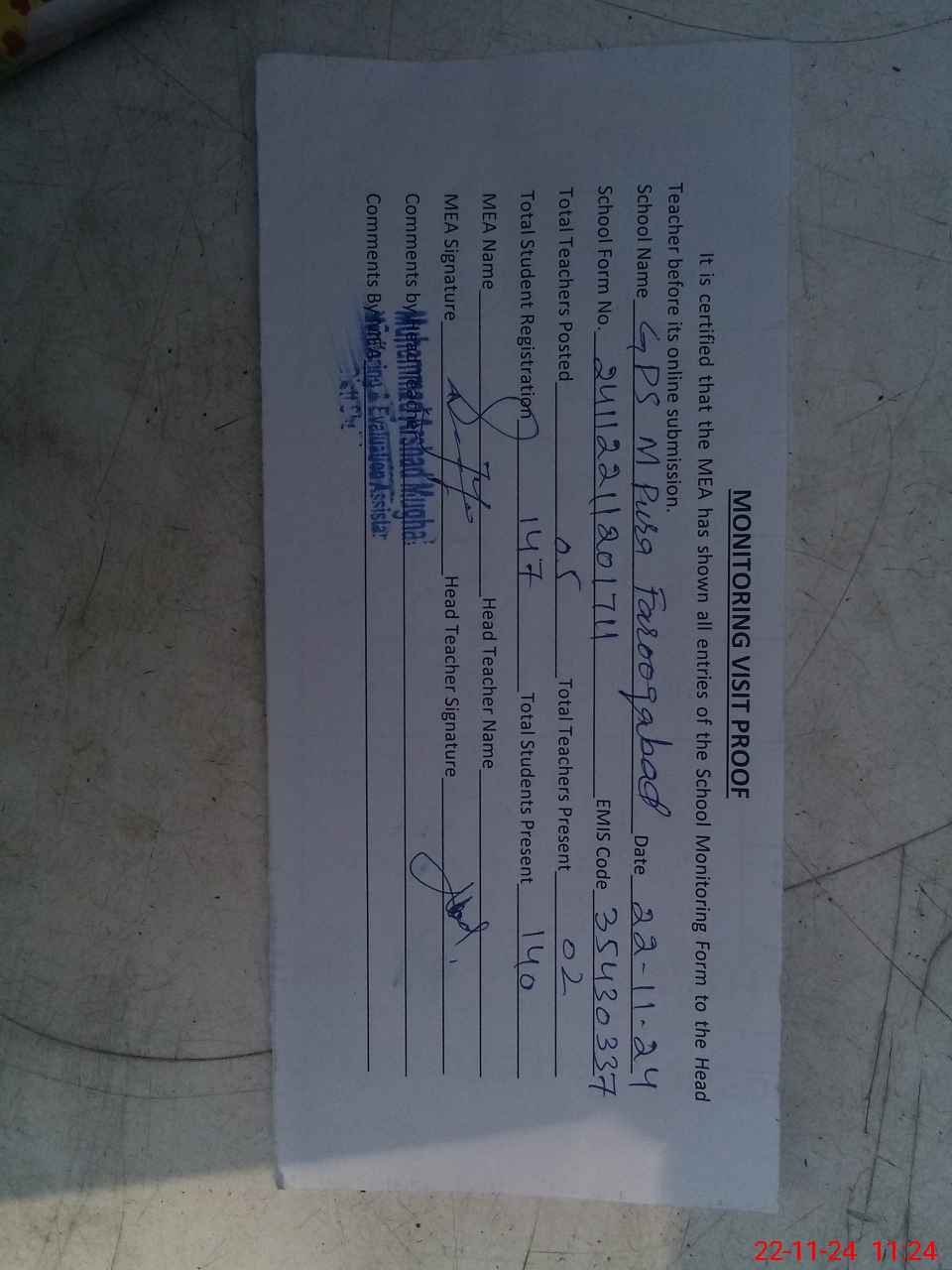| Attendance Register | Head Teacher | MEA with School | Visit Proof |