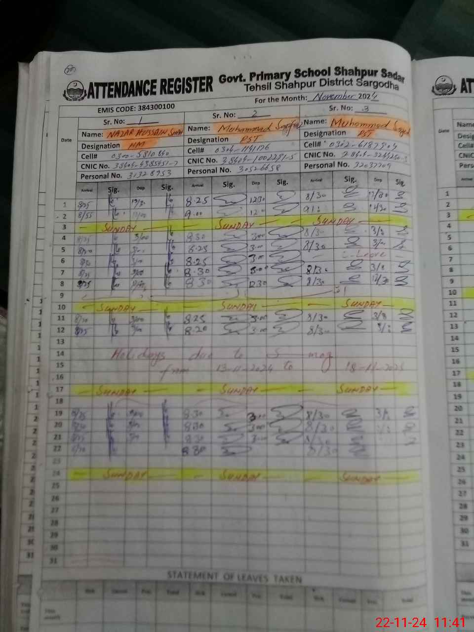 | CNIC | Full Name | Designation | R/C | Absence During Last Calender Month |