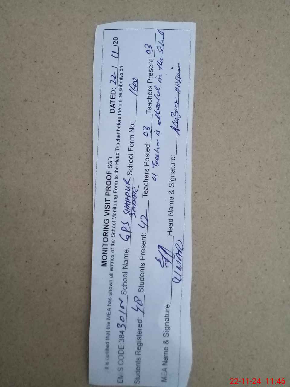| Attendance Register | Head Teacher | MEA with School | Visit Proof |