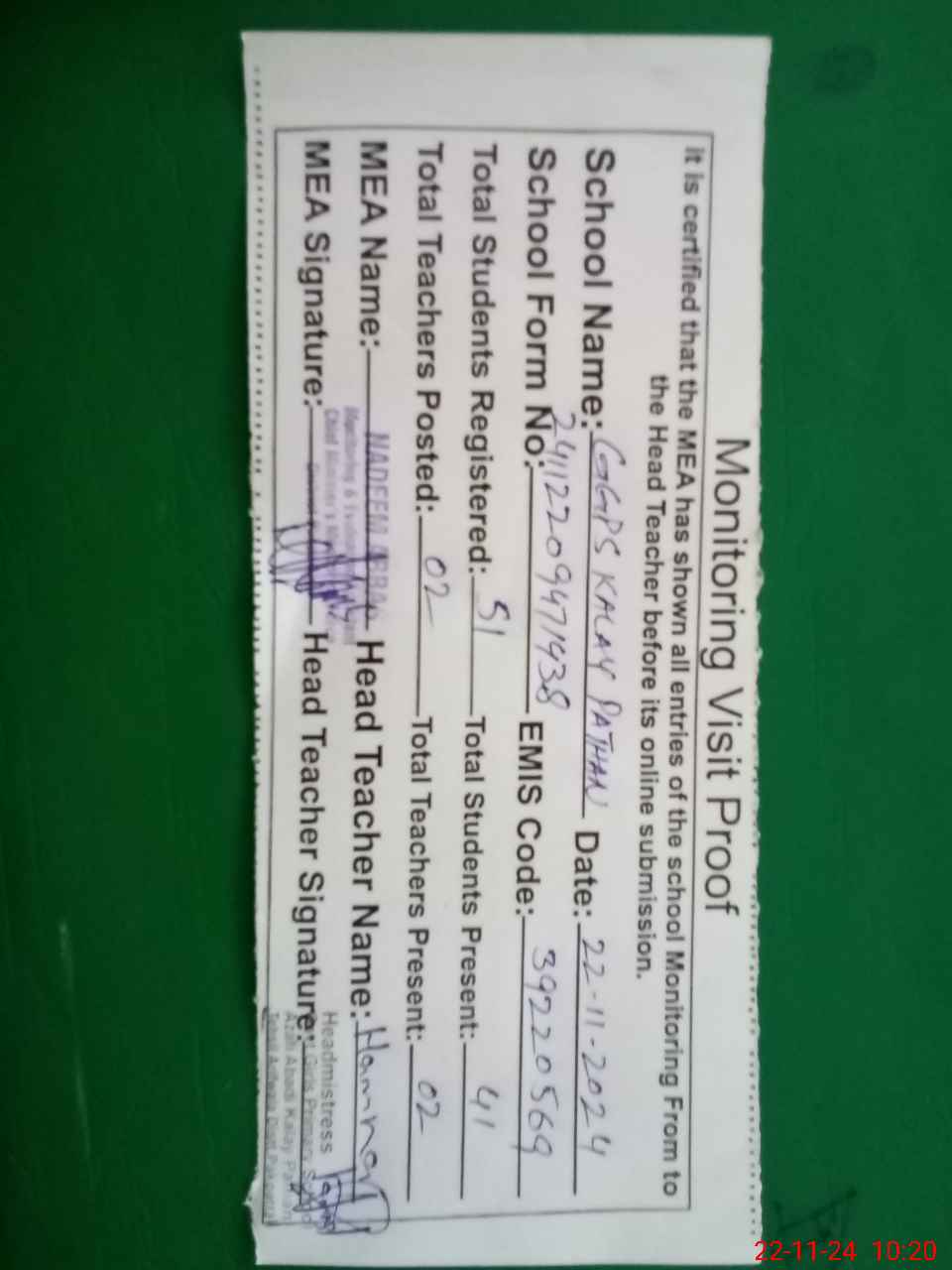 | EMIS Code: 39220569 | Name of School: GGPS KALAY PATHAN AZAFI ABADI | |||