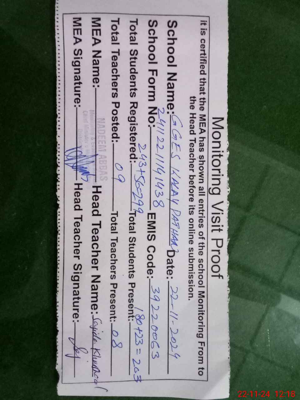 | Attendance Register | Head Teacher | MEA with School | Visit Proof |