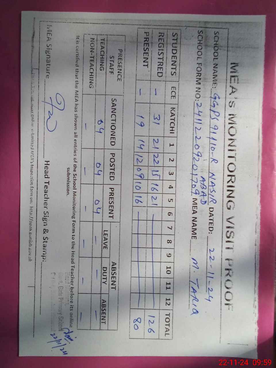 | Attendance Register | Head Teacher | MEA with School | Visit Proof |