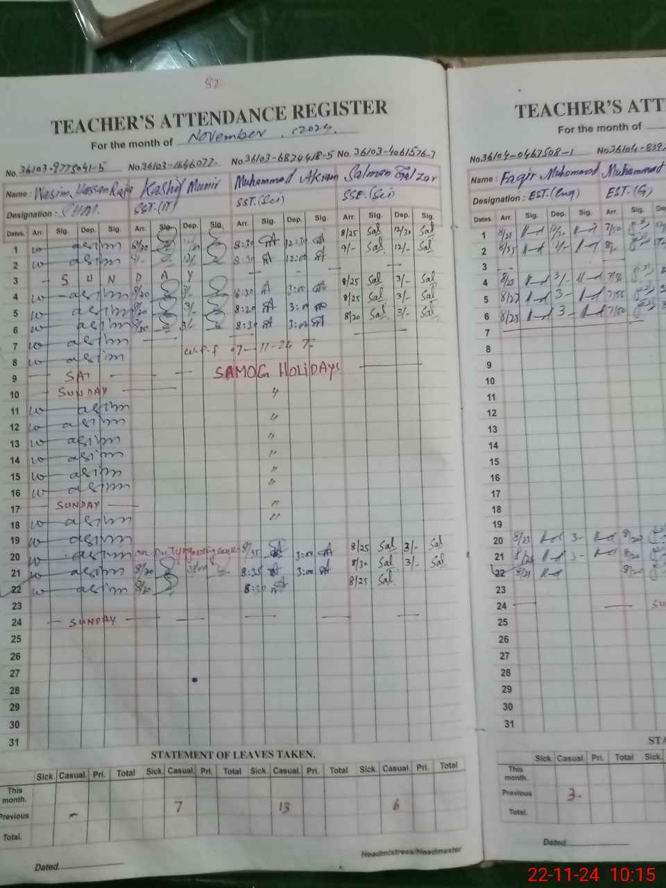 | CNIC | Full Name | Designation | R/C | Absence During Last Calender Month |