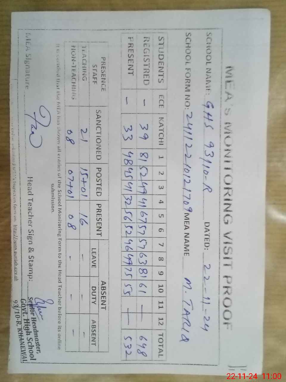 | Attendance Register | Head Teacher | MEA with School | Visit Proof |