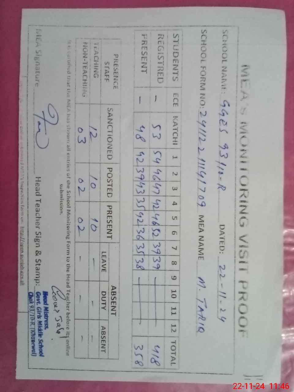 | Attendance Register | Head Teacher | MEA with School | Visit Proof |