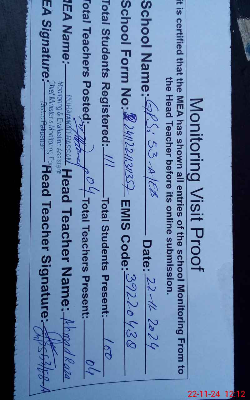 | EMIS Code: 39220438 | Name of School: GPS CHAK NO. 53 EB A | |||