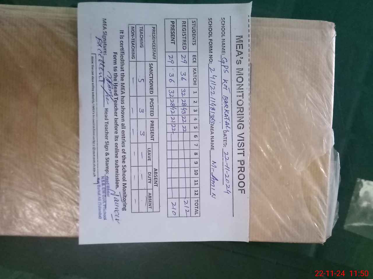 | Attendance Register | Head Teacher | MEA with School | Visit Proof |