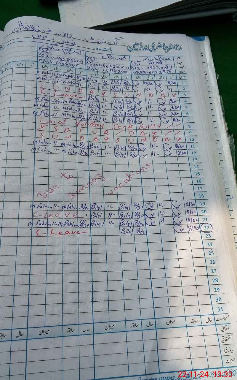 | CNIC | Full Name | Designation | R/C | Absence During Last Calender Month |
